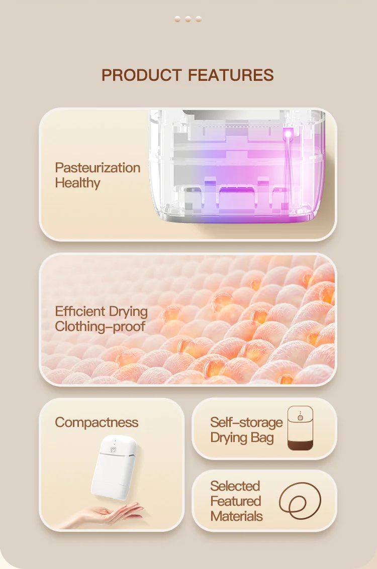 Compact portable electric clothes dryer saves space and comes with an automatic drying bag design.